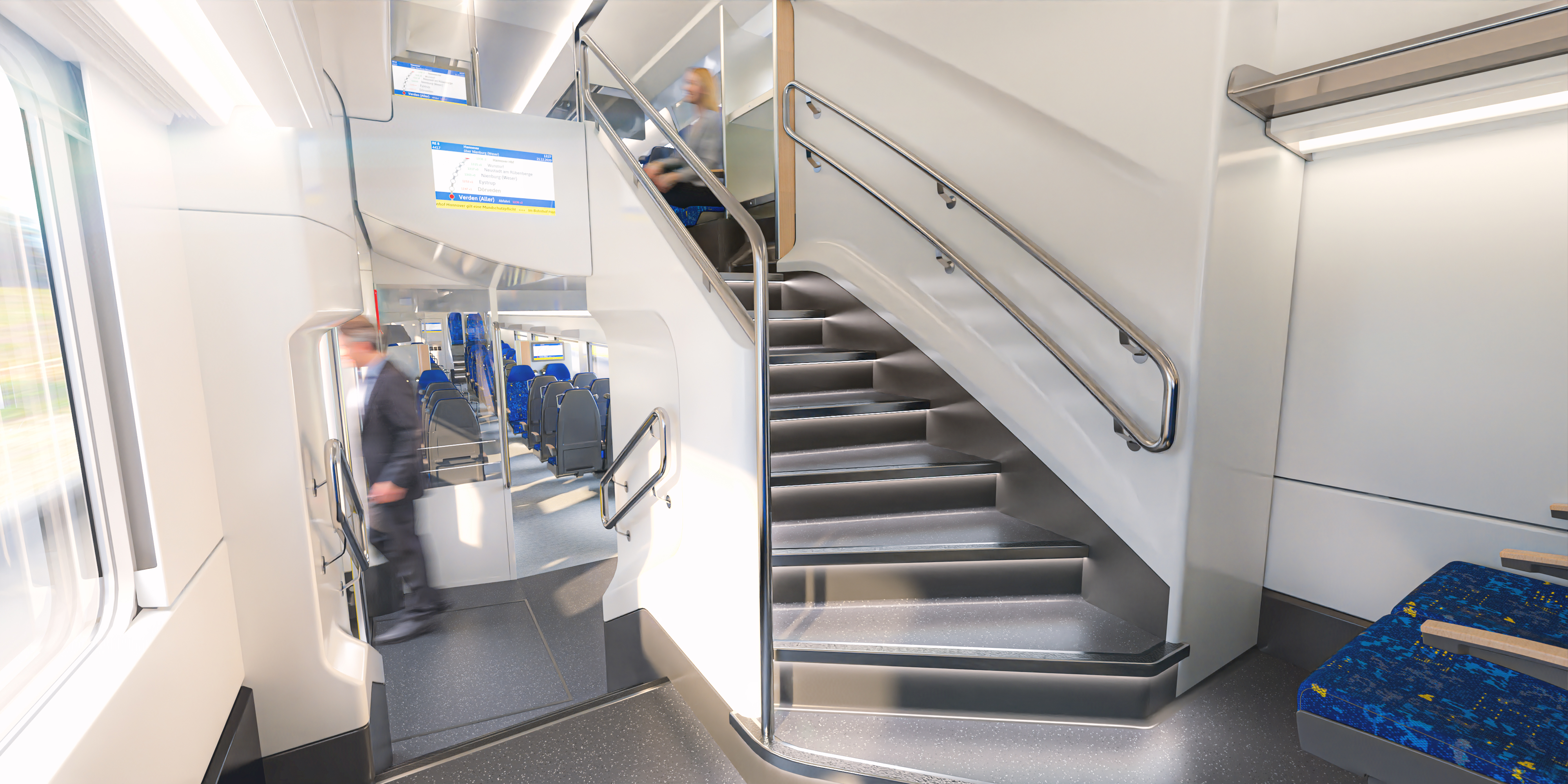 Fahrzeugtür von innen mit Blick in Abteil und Treppe nach oben. Quelle: Alstom
